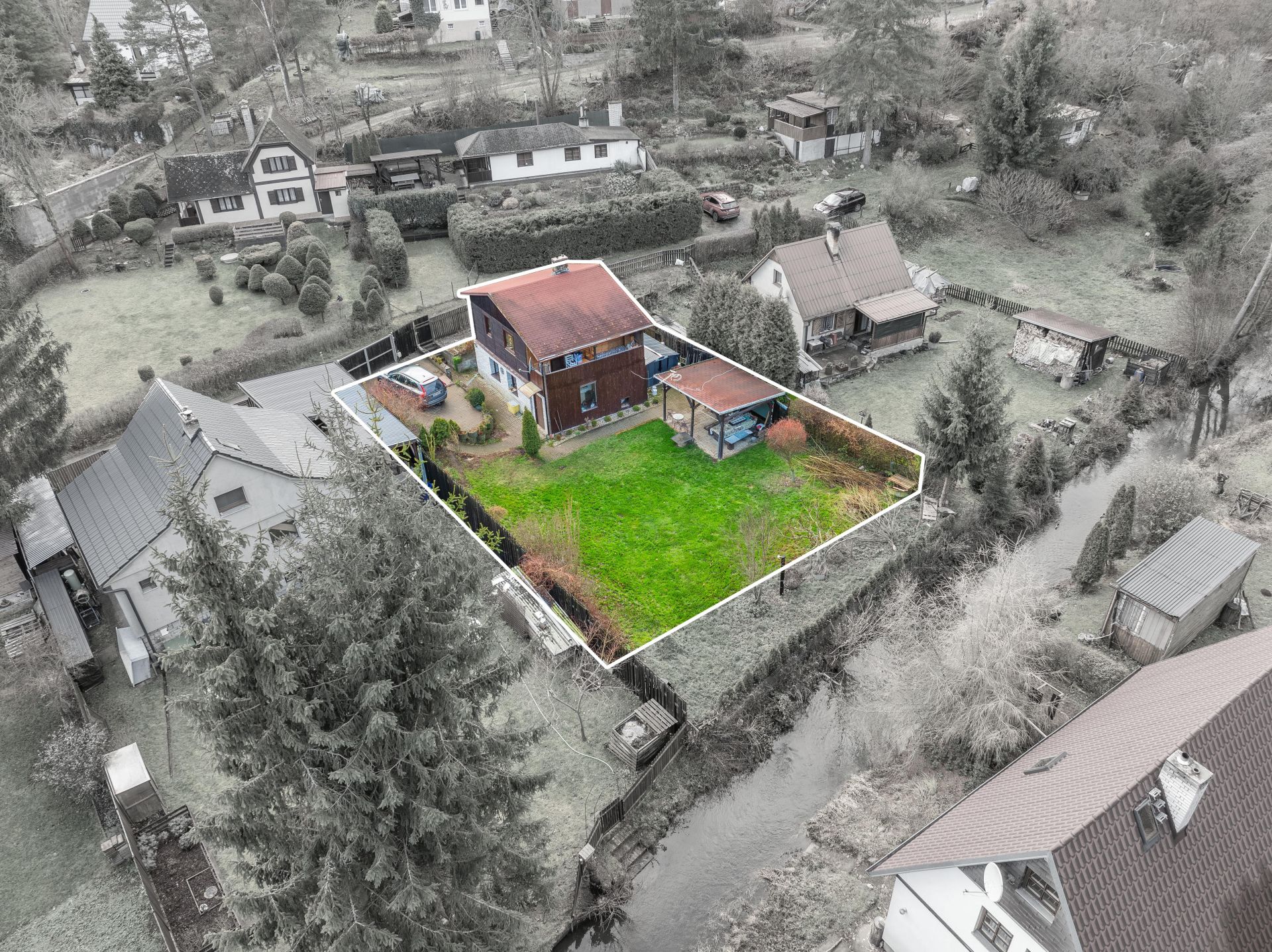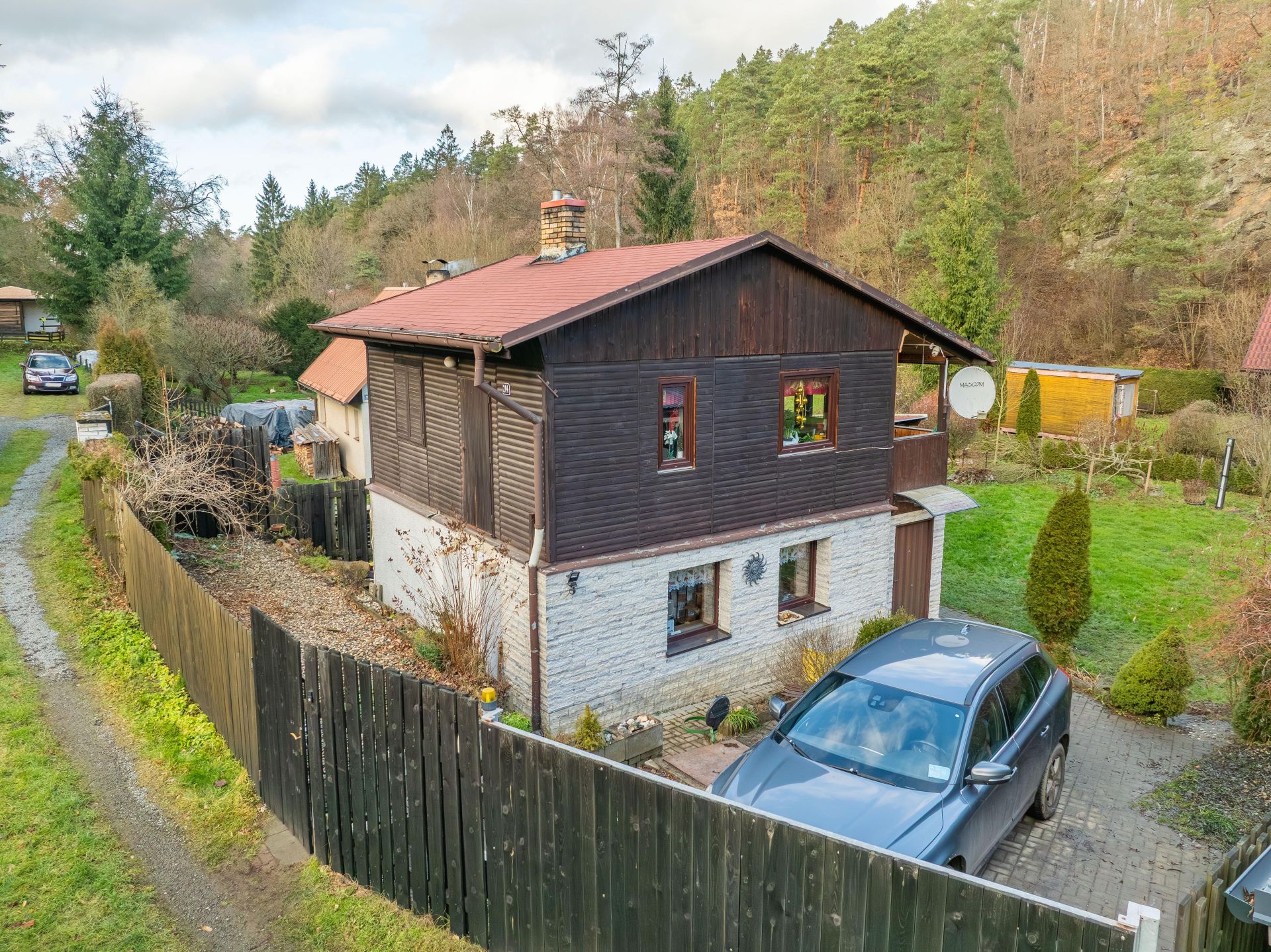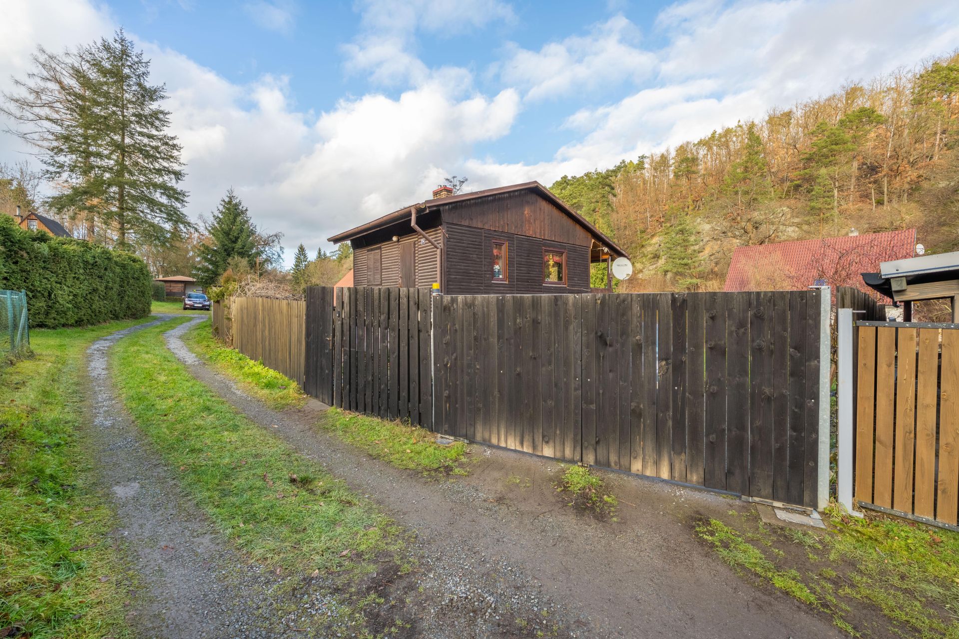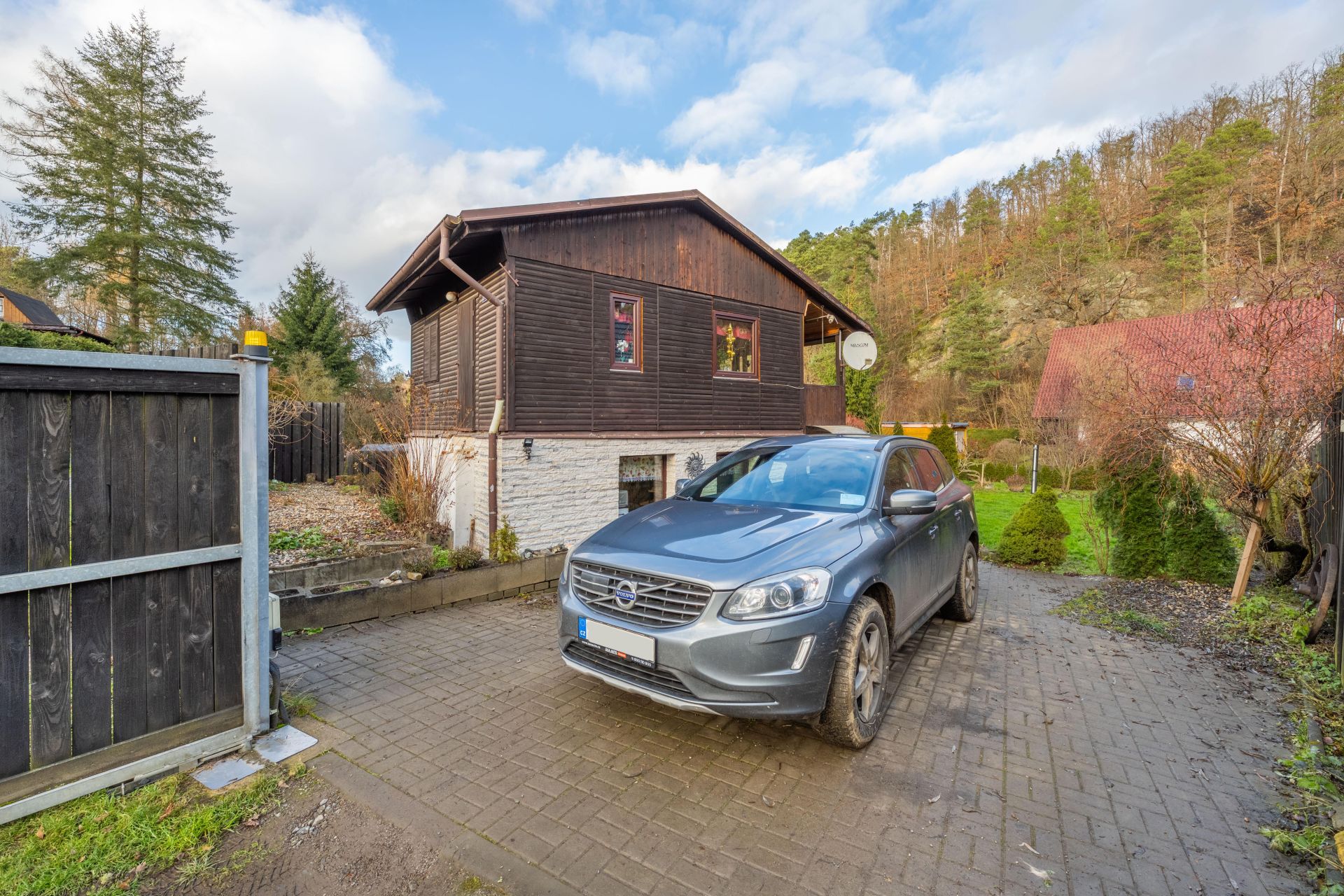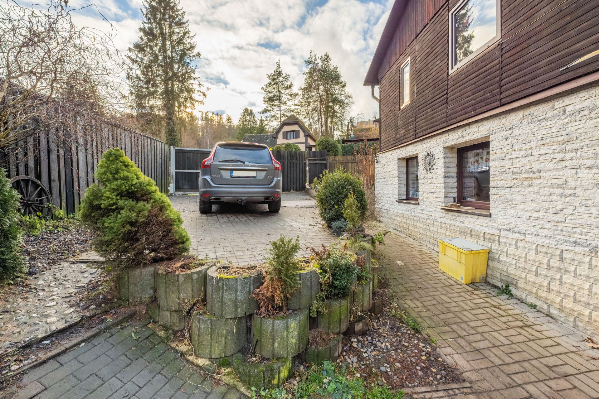 Na pozemku je vybudováno zpevněné parkovací stání až pro 2 auta, vjez má automatická vrata na dálkové ovládání.