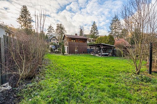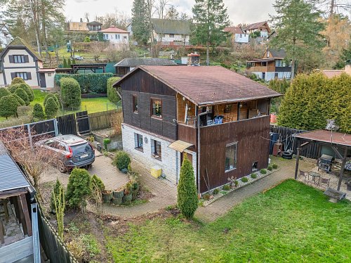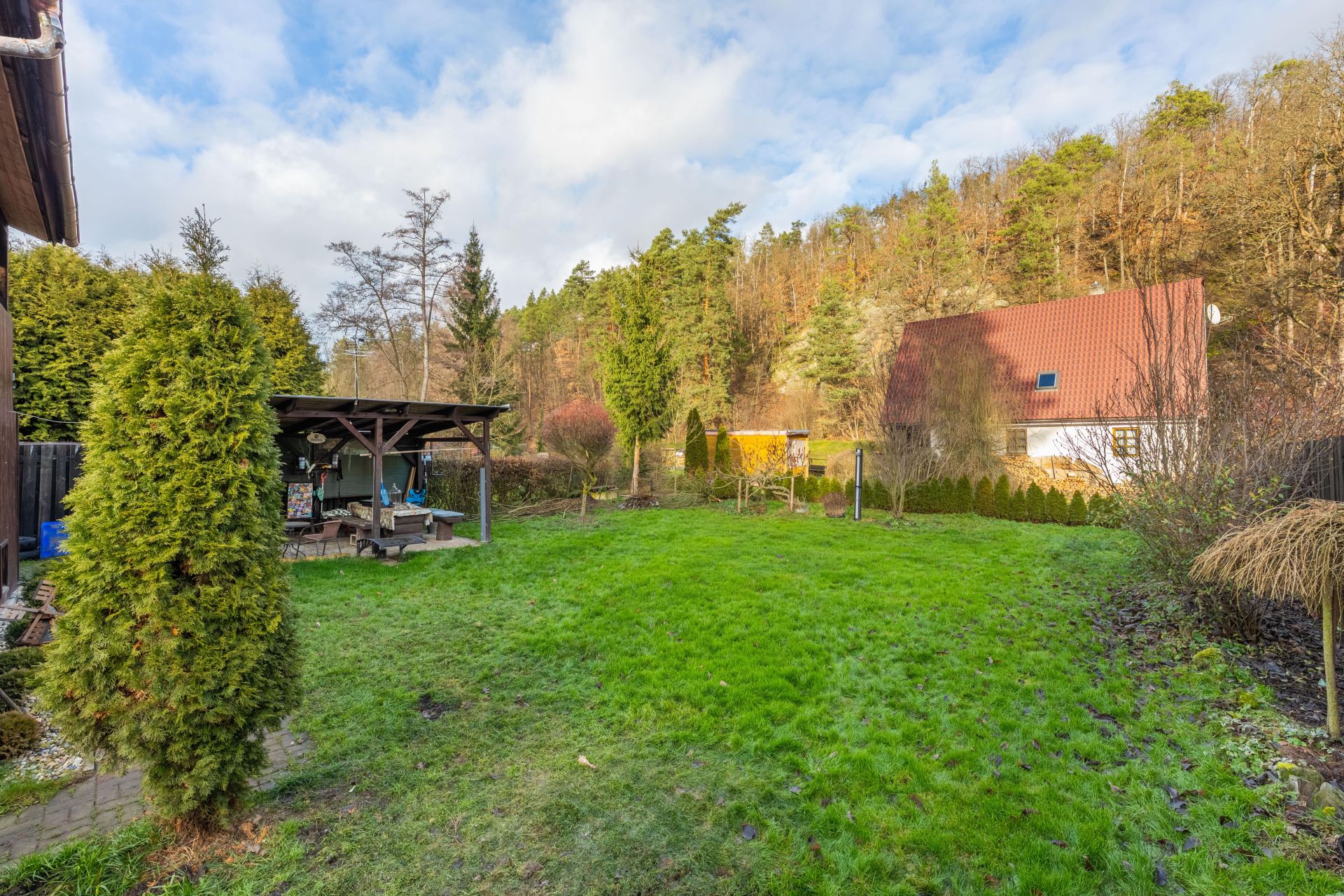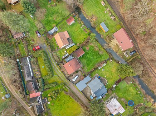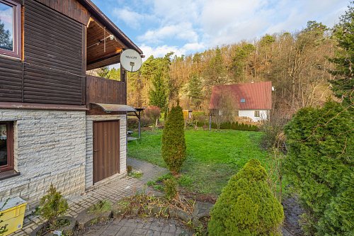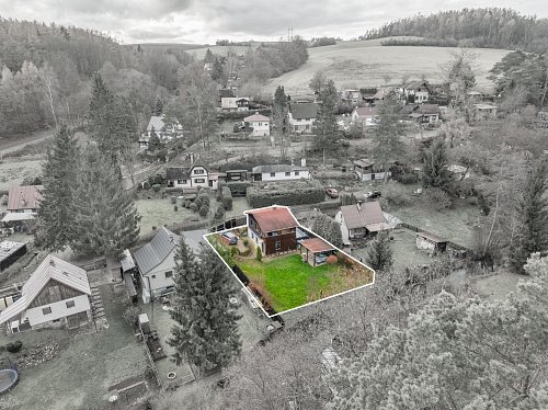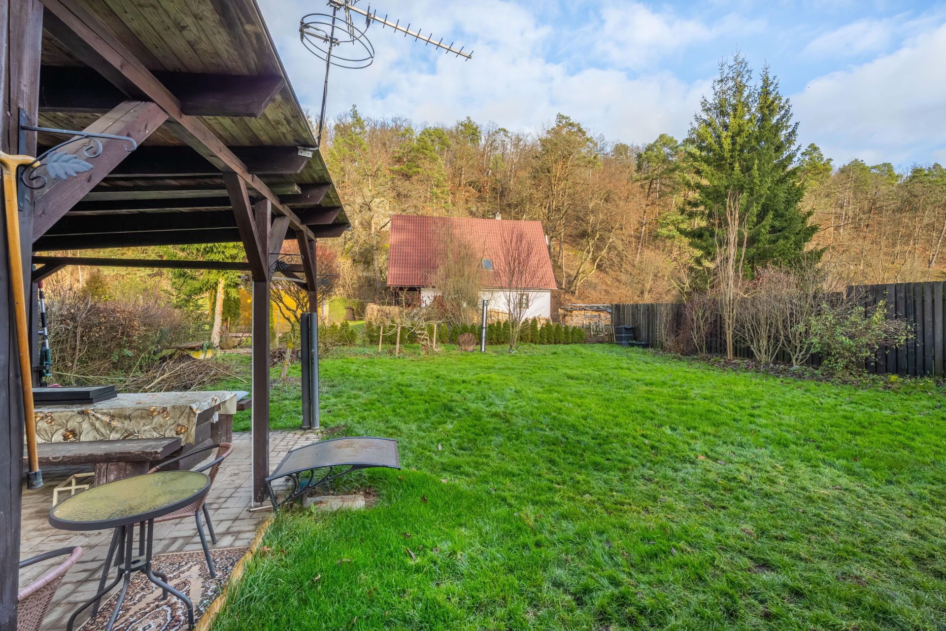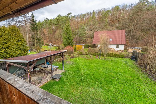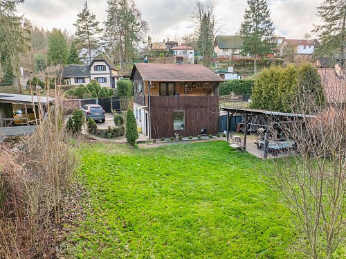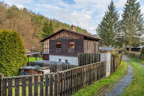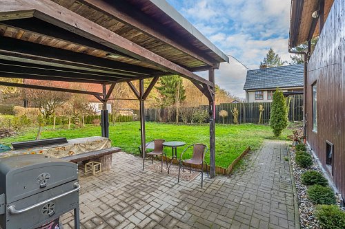 Na zahradě je postaven přístřešek, který určitě využijete třeba při letním grilování. Za chatou je také plechový sklad, kde schováte spoustu věcí.