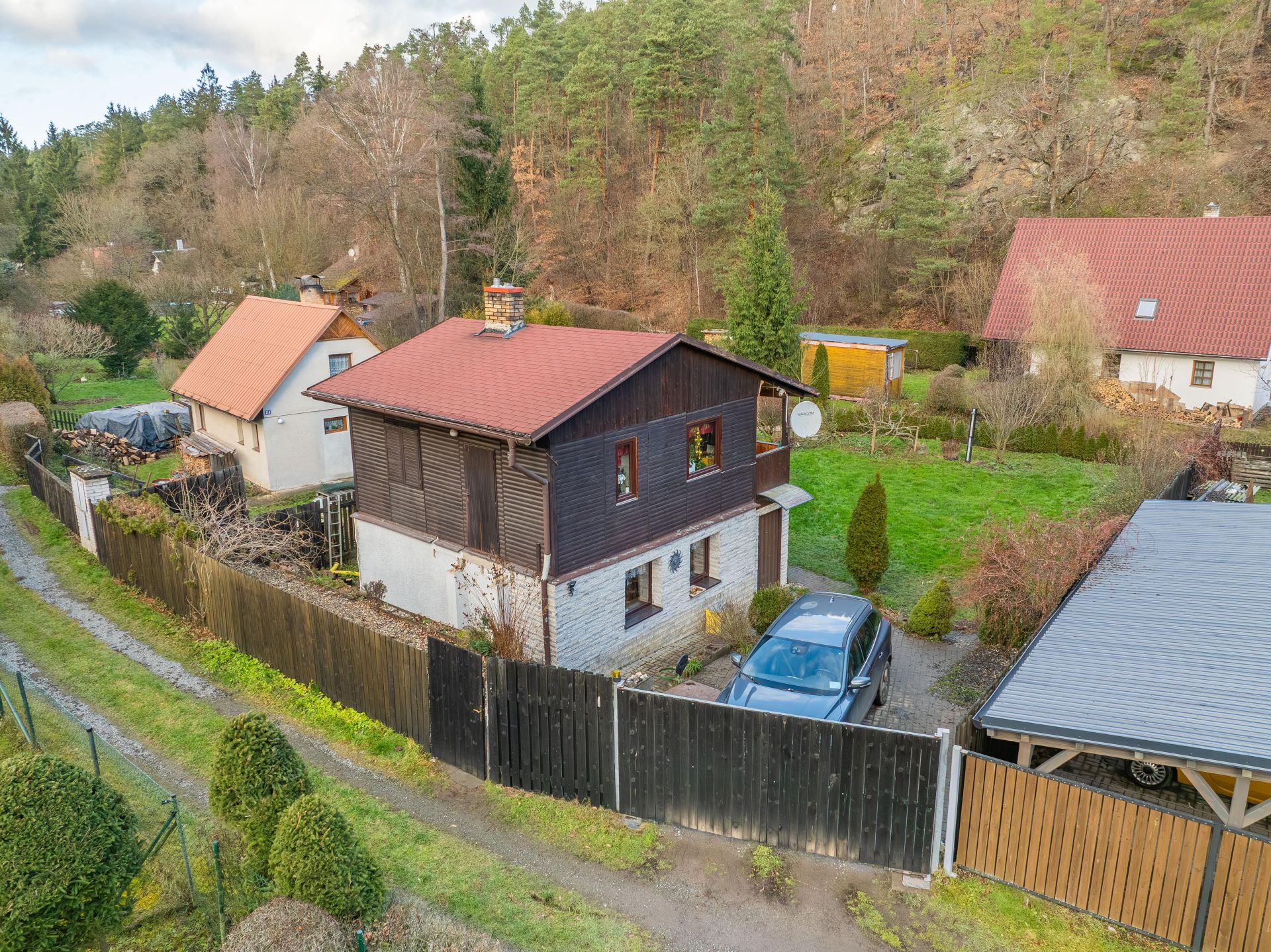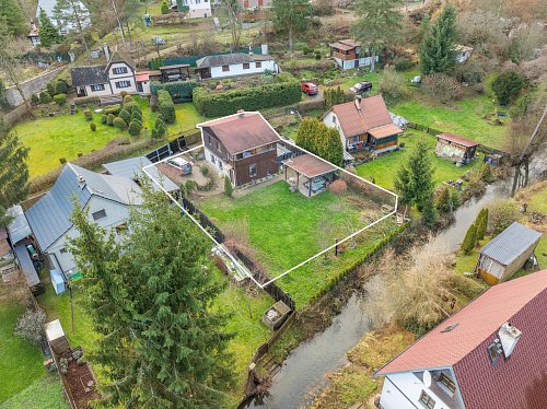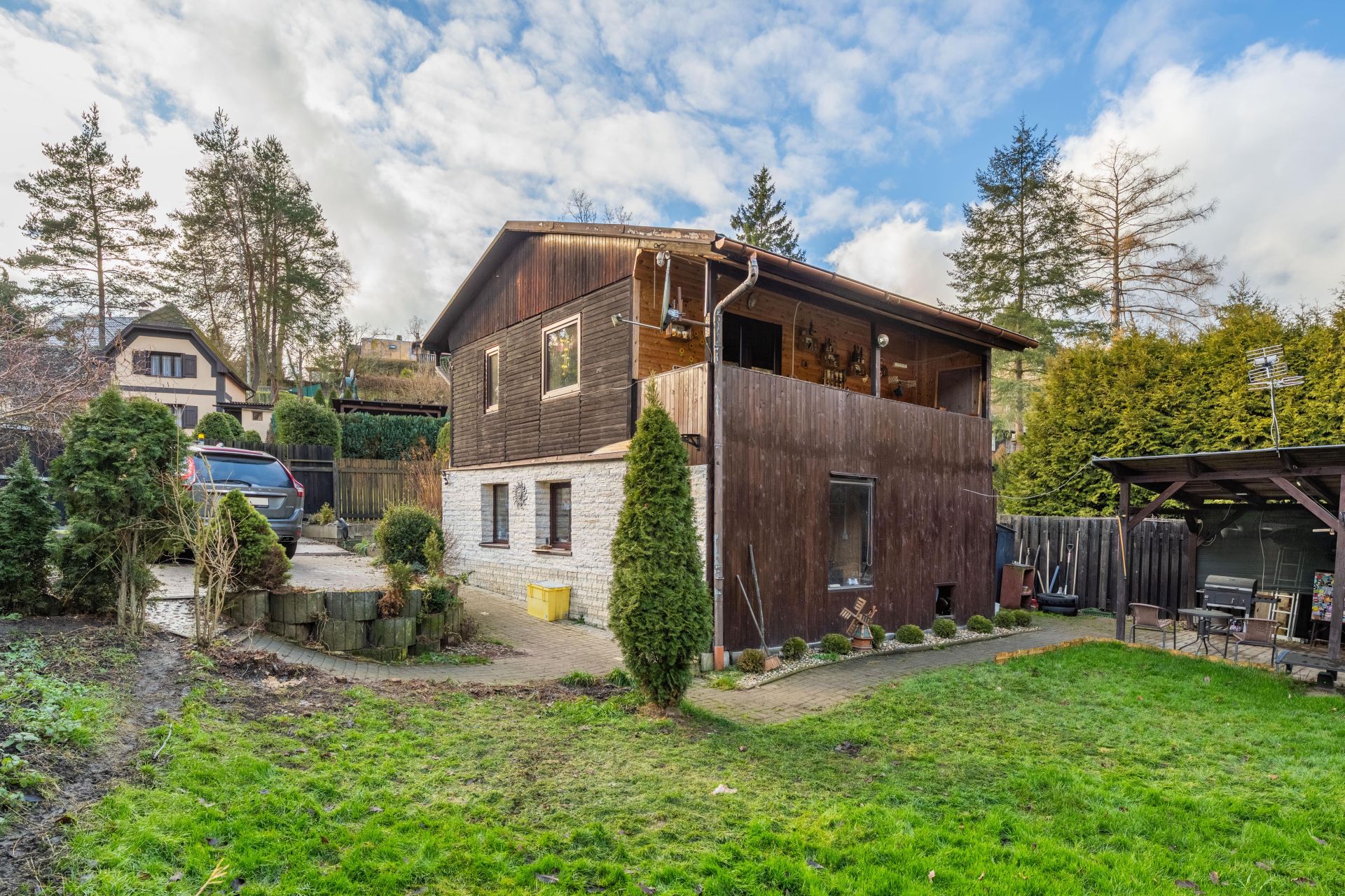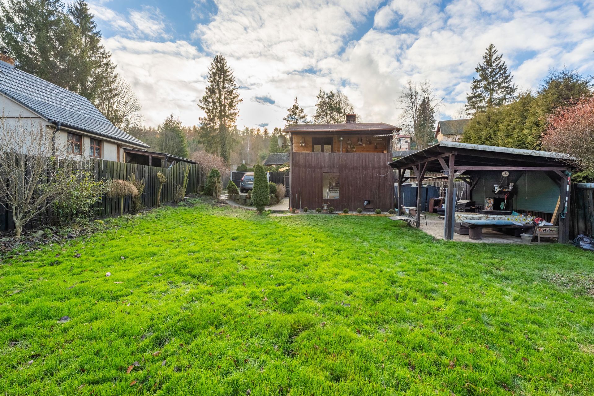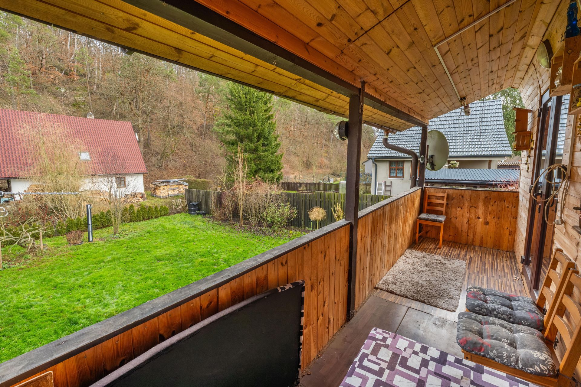 Na zahradě je postaven přístřešek, který určitě využijete třeba při letním grilování. Za chatou je také plechový sklad, kde schováte spoustu věcí.