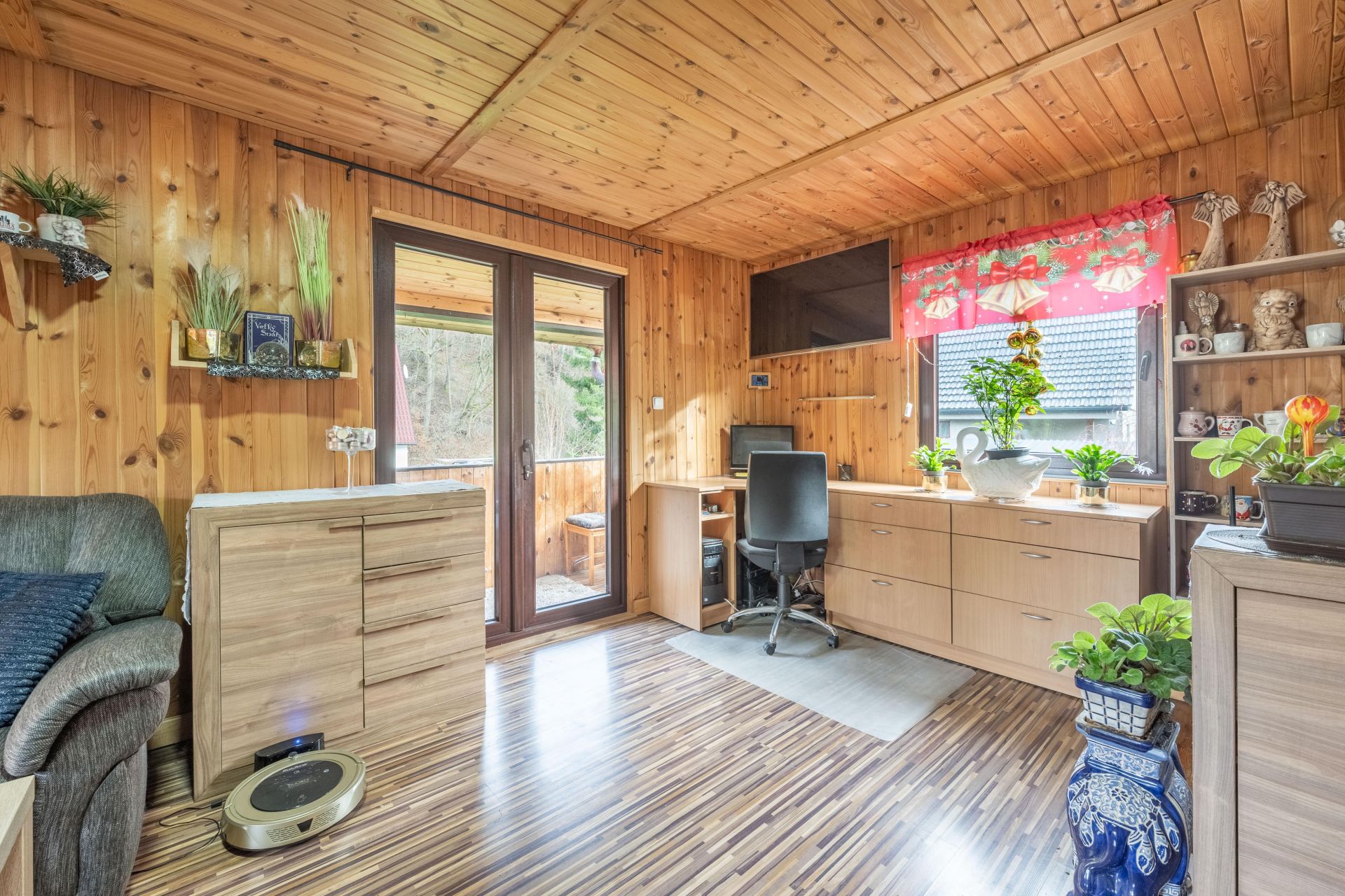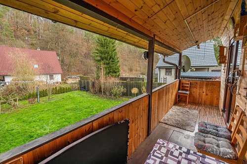 Chata má v přízemí pokoj s kuchyňským koutem, předsíň a dílnu. V patře je ložnice, koupelna s WC a další pokoj, ze kterého vyjdete na velkou lodžii s výhledem do zahrady.