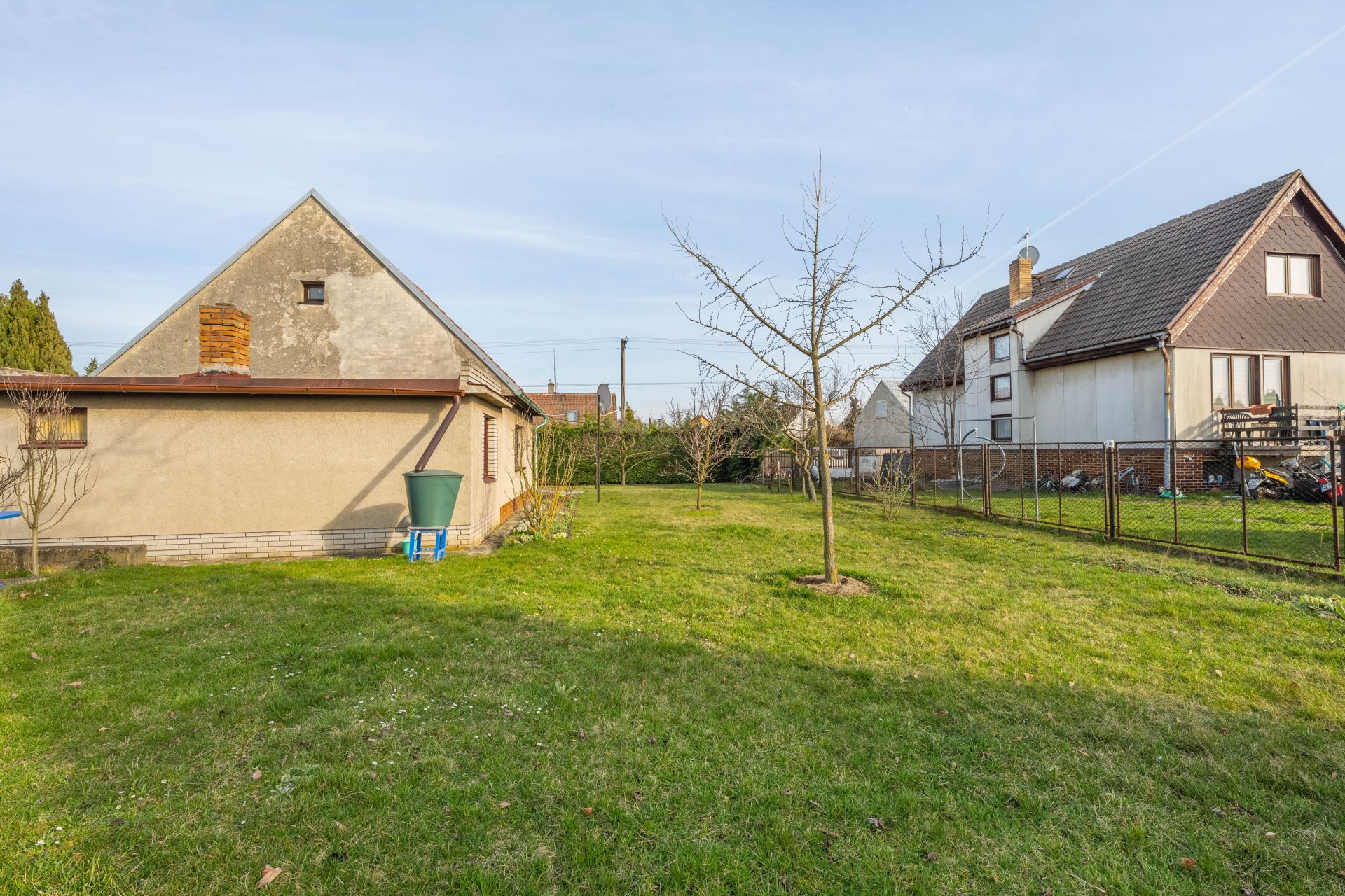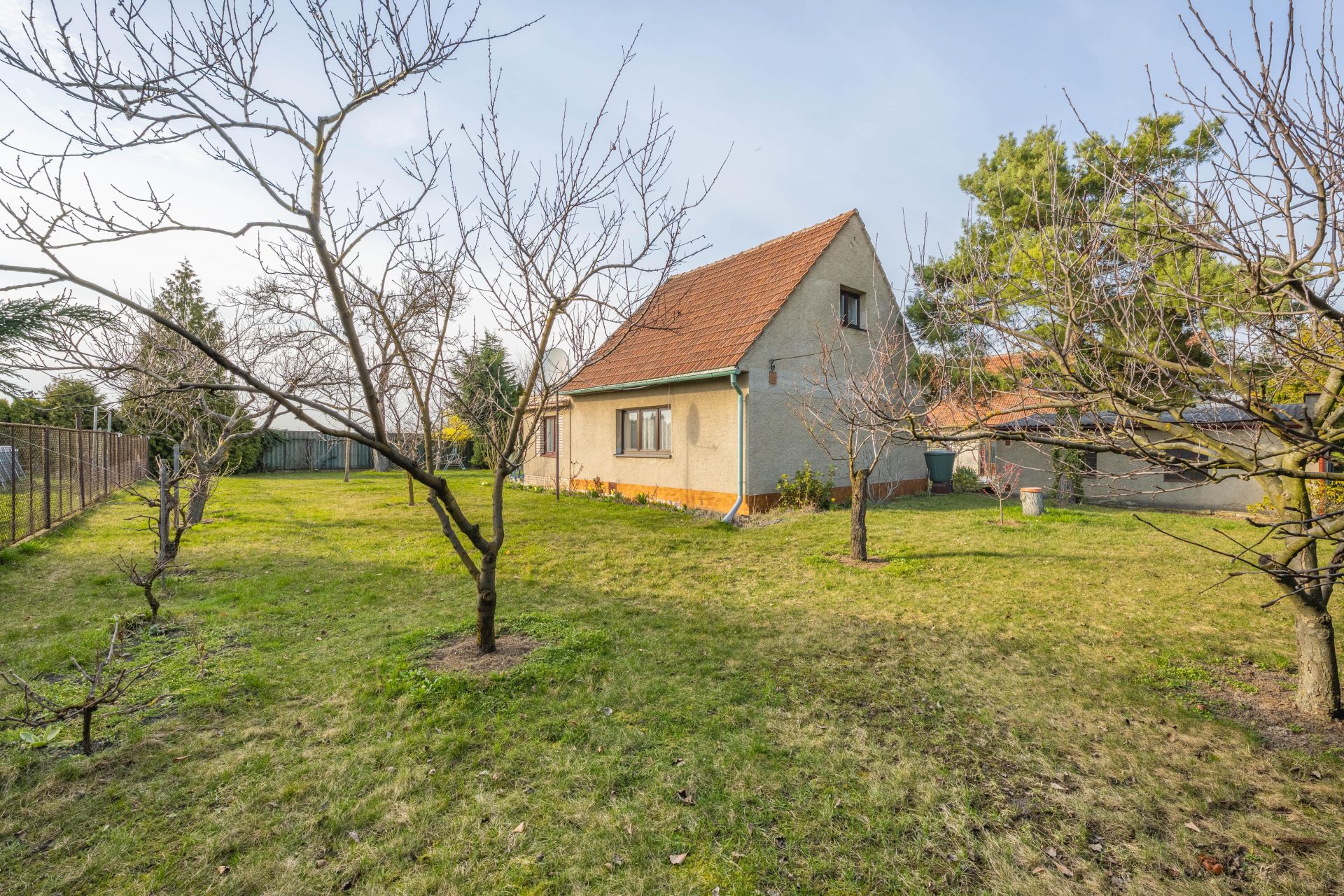 Zahrada je rovinatá, zatravněná, s vysázenými ovocnými stromy.