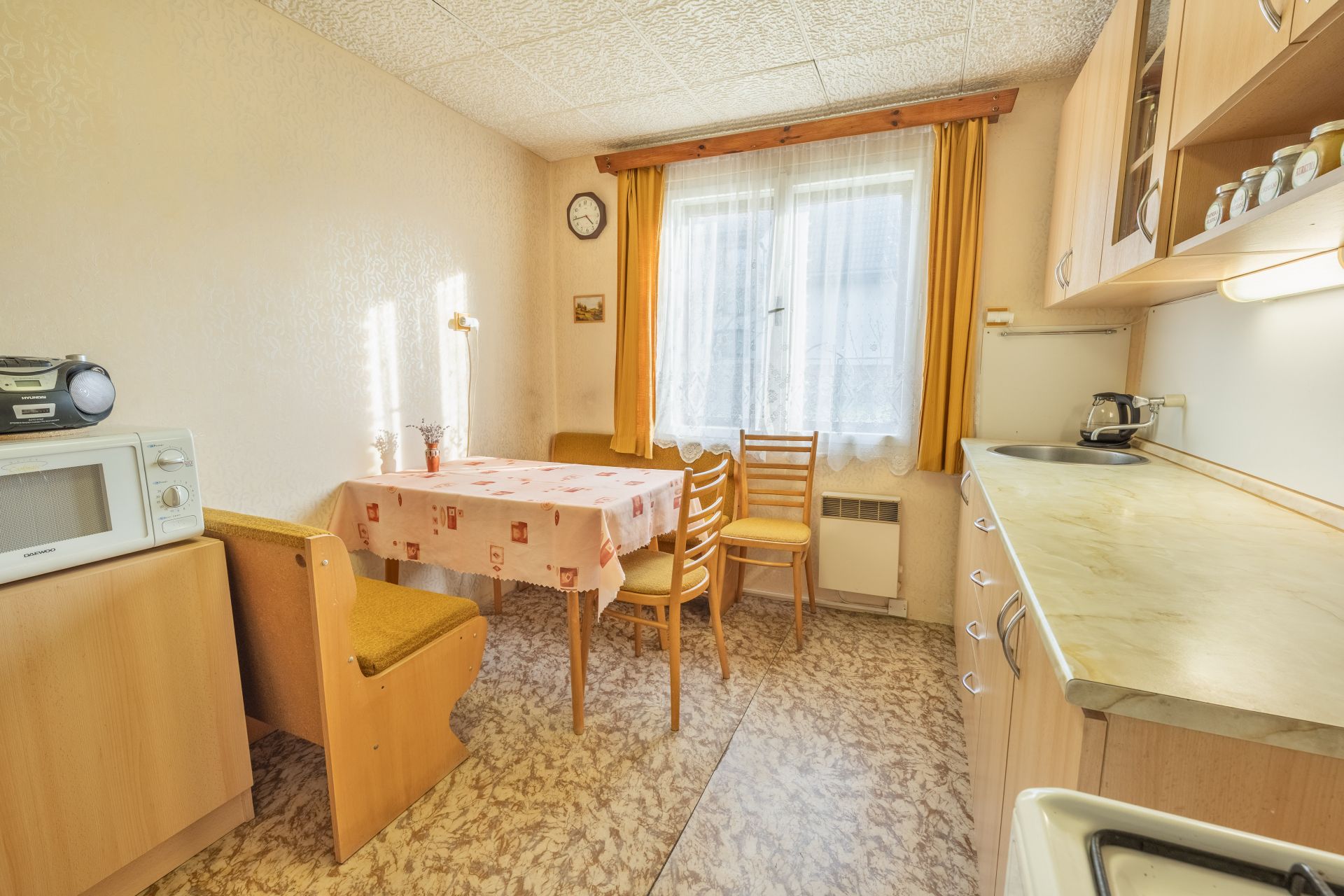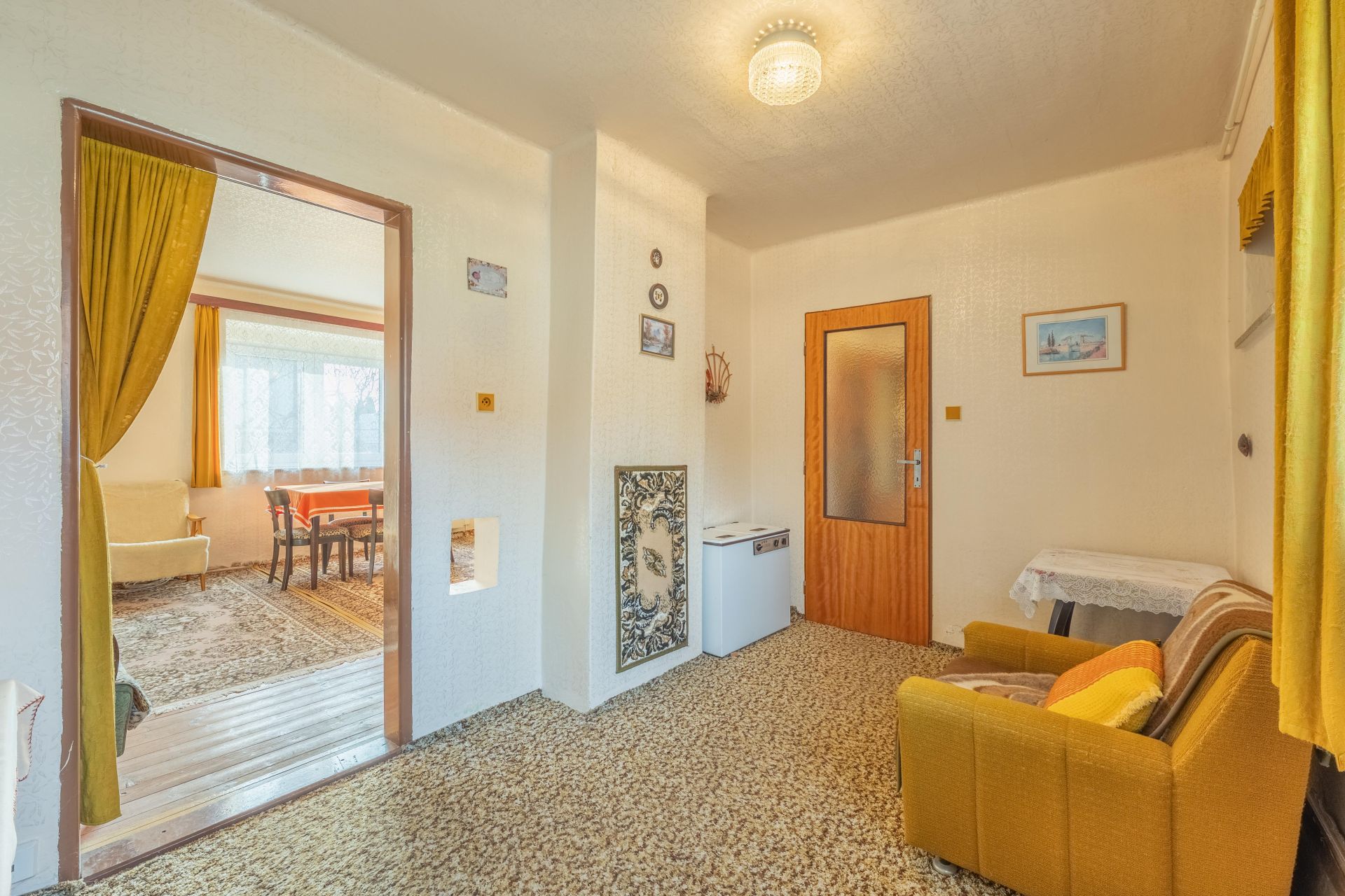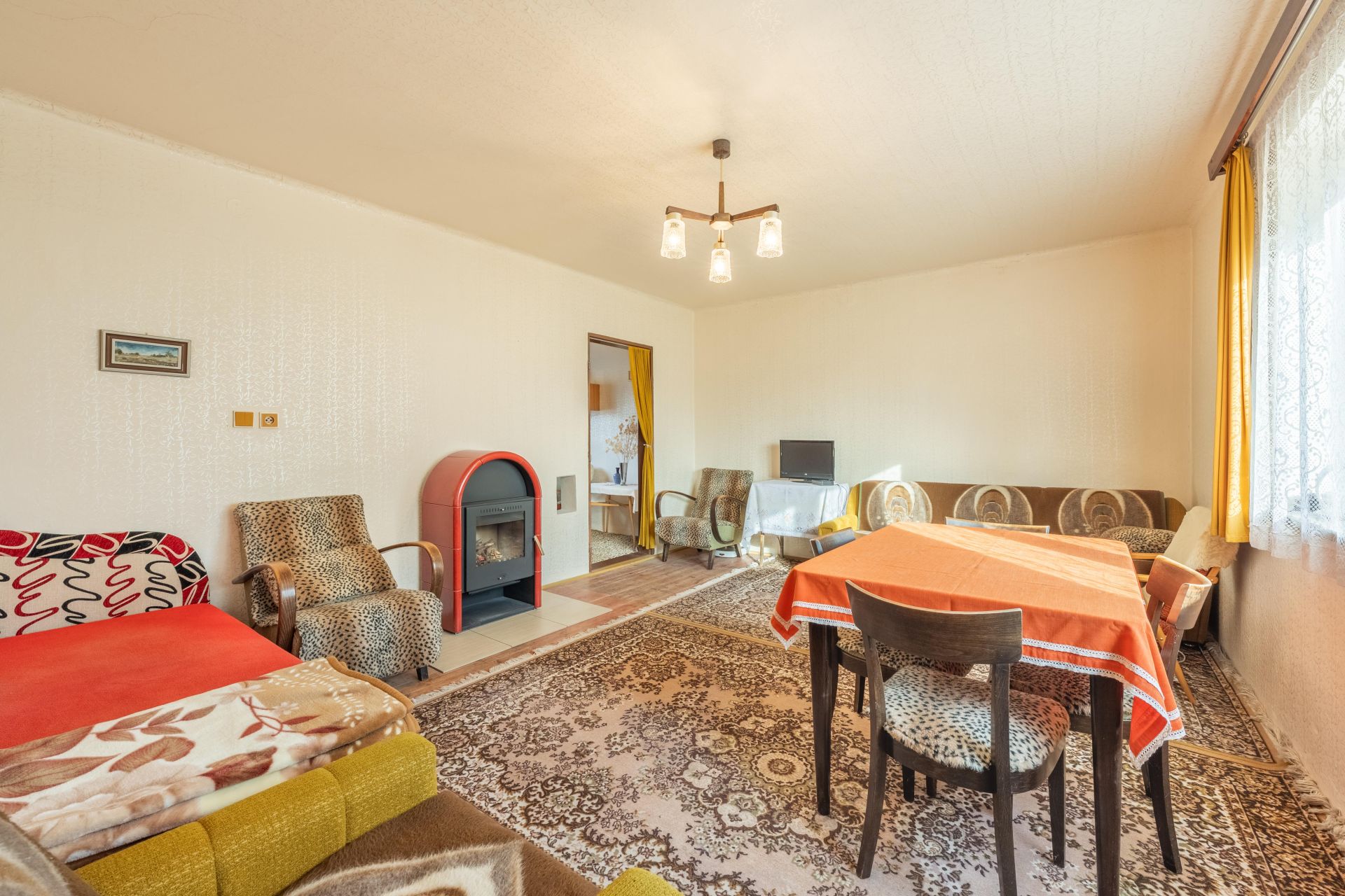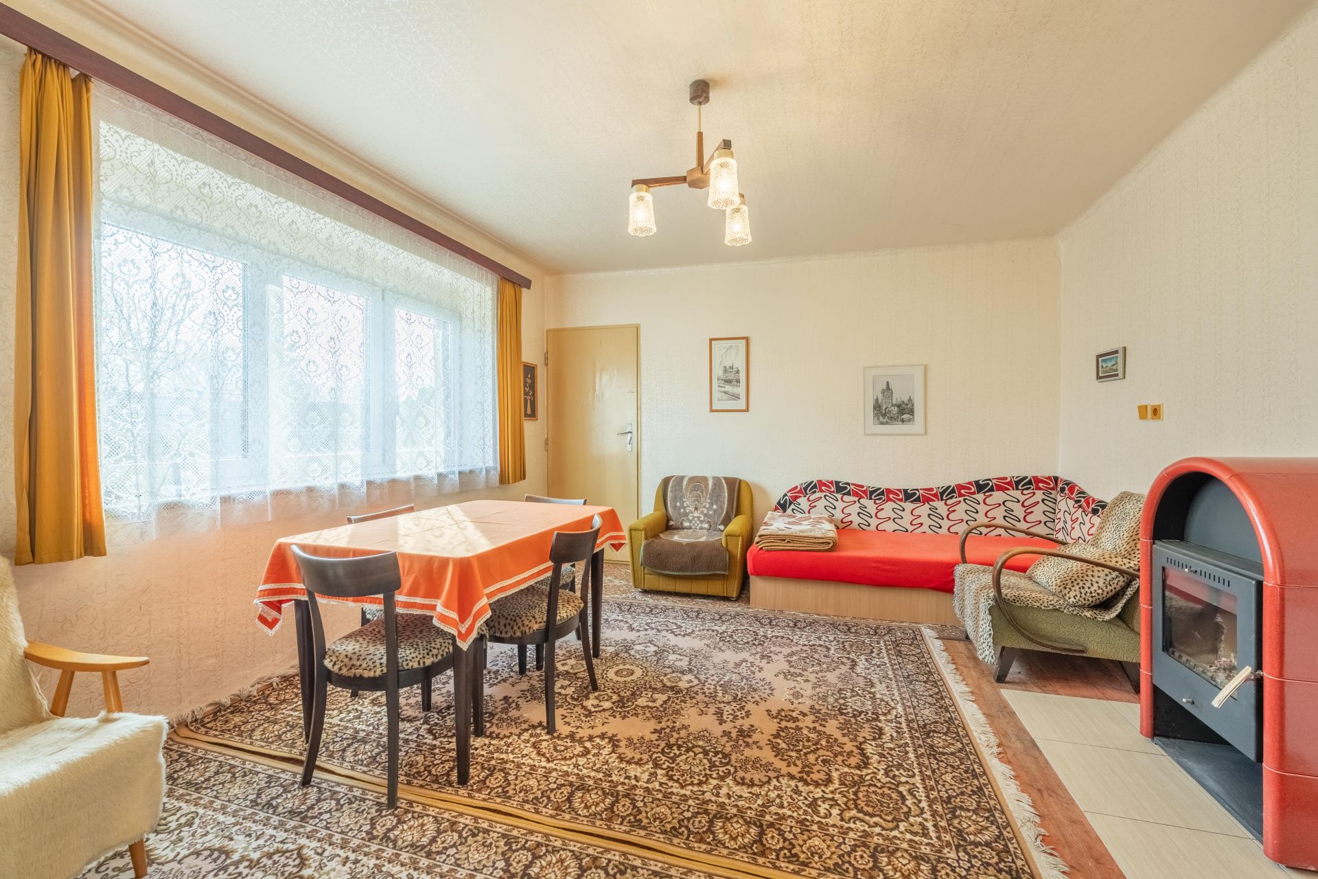 V obývacím pokoji jsou instalována krbová kamna, která vám zajistí příjemné chvíle během chladného období.