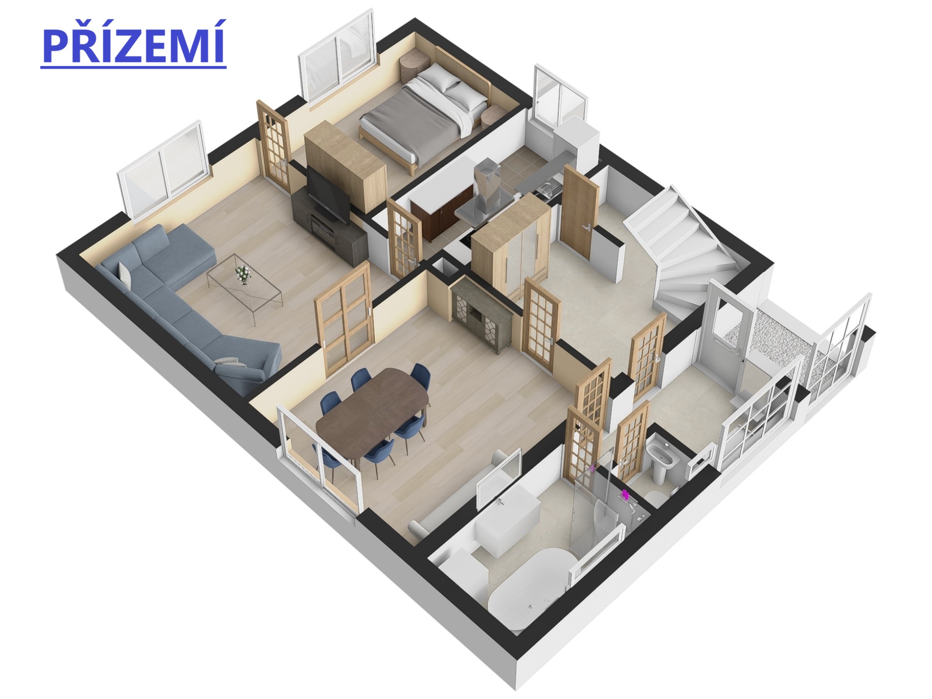Proběhla rekonstrukce přízemí - koupelna s vanou a sprchovým koutem, samostatné WC, kuchyňská linka, podlahy ve všech místnostech.