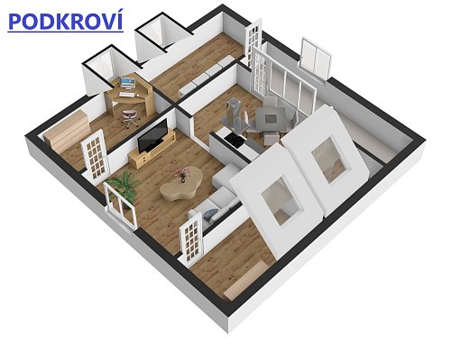 V podkroví jsou vybudovány 2 větší obytné místnosti s rovným stropem a 4 menší, s využitím třeba jako pracovna, šatna a úložné prostory. Všechny místnosti mají okno.